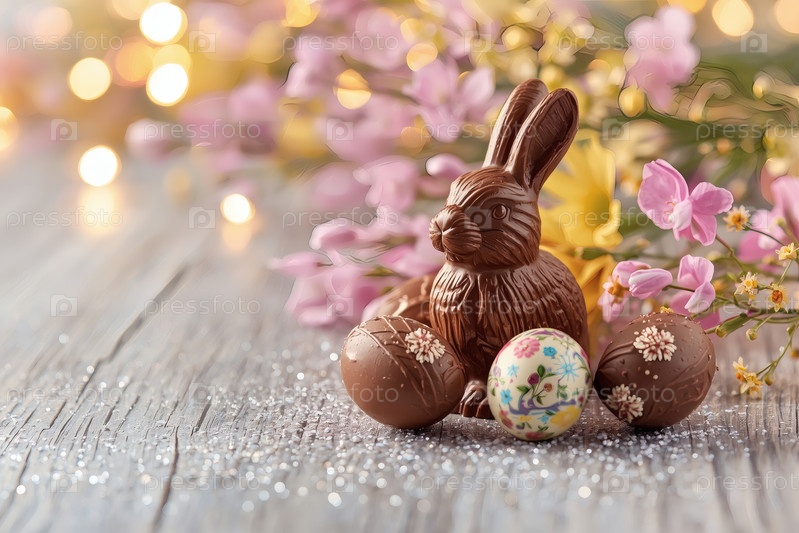 Шоколадное пасхальное яйцо, шоколадный кролик и весенние цветы на деревянном фоне. Пасхальные сладости и лакомства. Концепция яркого праздника Пасхи в 2026 году. Хорошая открытка
