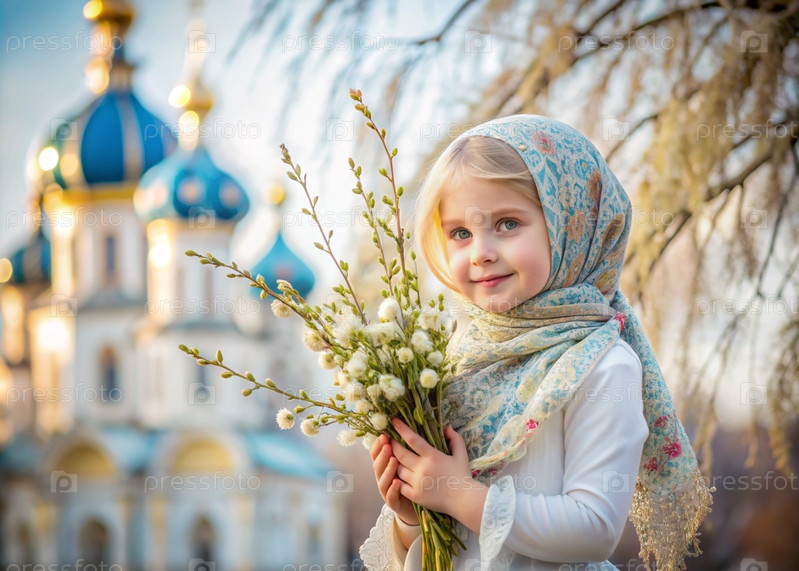 Неделя пальмовых деревьев. христианство. портрет трехлетней девочки в русском народном шале с ветвями ивы в руках на фоне церкви и заката