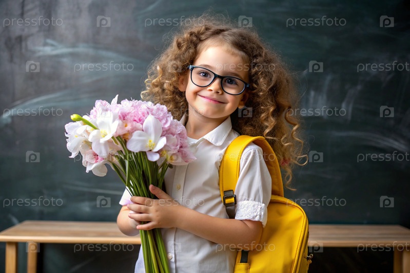 Милая, красивая первоклассница с очками. Букет цветов. Ребенок впервые идет в школу. Ребёнок с рюкзаком, книгой и цветами. Возвращение к школе