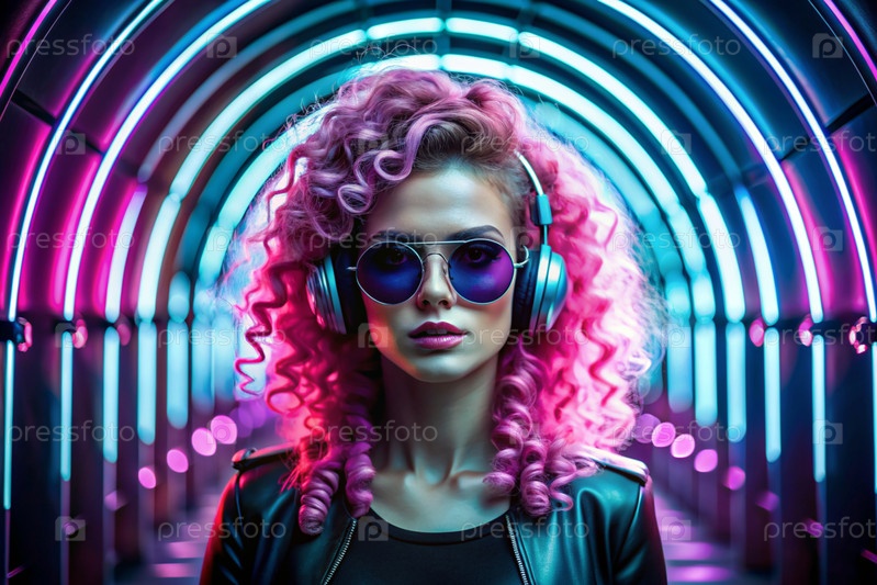 Молодая красивая девушка в солнцезащитных очках слушает музыку на больших беспроводных наушниках, стоя в неонном туннеле среди неоновых вывесок