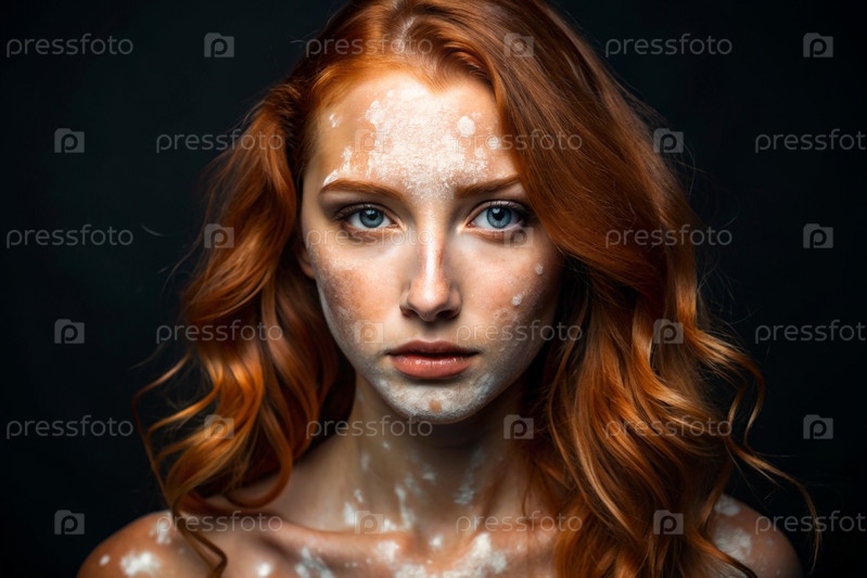 Лейкодермия. Витилиго. Плохая пигментация кожи. Большие белые пятна по всему телу и лицу. Портрет красивой девушки с кожными заболеваниями