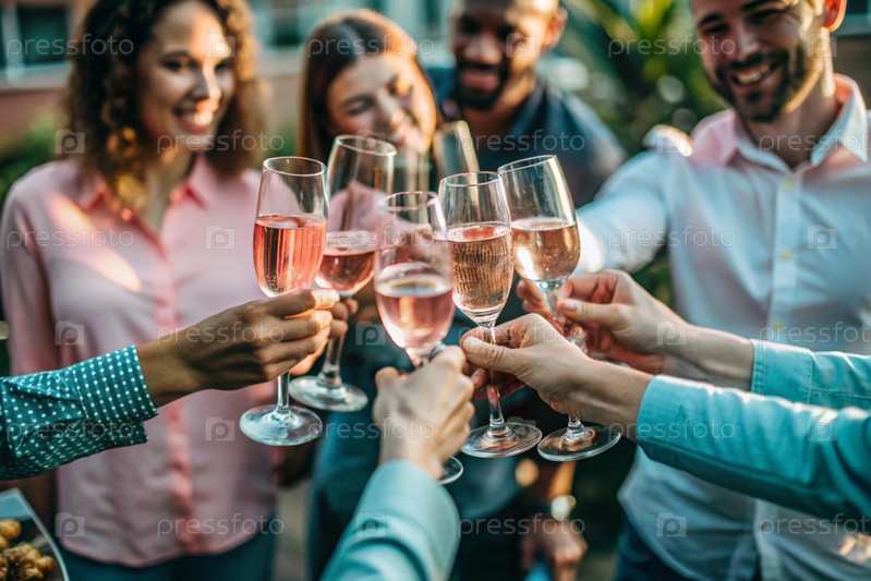 Стаканы розового игристого вина в руках людей. Люди отдыхают на открытой веранде. Понятие праздника, корпоративного мероприятия, вечеринки или праздника