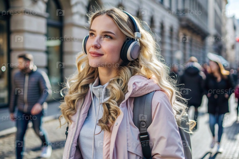 Музыкальный любитель. молодая красивая кудрявая женщина с рюкзаком на фоне улицы и людей. Турист слушает музыку в наушниках и гуляет по городу