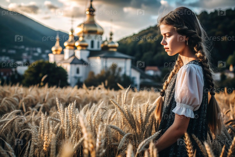 Молодая девушка в льняном платье на фоне поля спелых золотых пшениц и православной церкви при закате солнца
