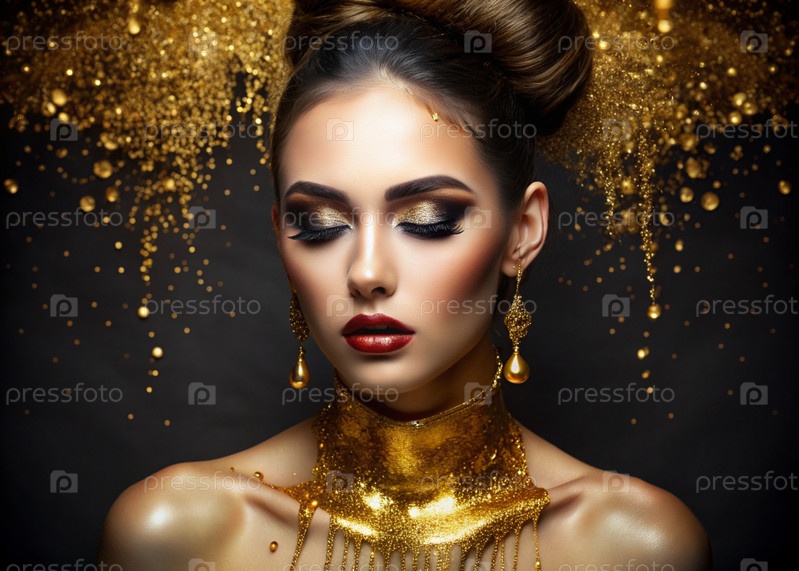 Творческий баннер для салона красоты в черно-золотых тонах. Профессиональный макияжный художник, стилист и парикмахер. Модный праздничный макияж. Красивая женщина с вечерним гримом. Индустрия красоты