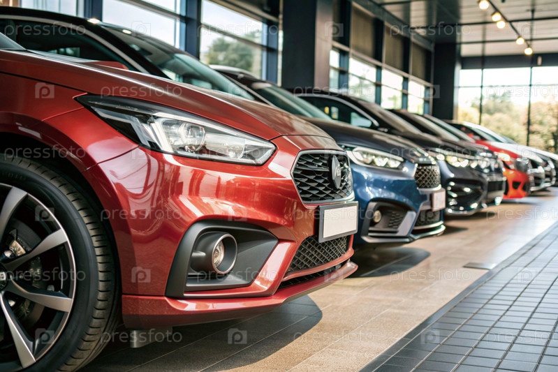 Офис современного автосалона. Бизнес-концепция продаж и аренды автомобилей. Новый автомобиль припаркован в современном автосалоне. Концепция автолизинга и страхования. Электрическое транспортное средство