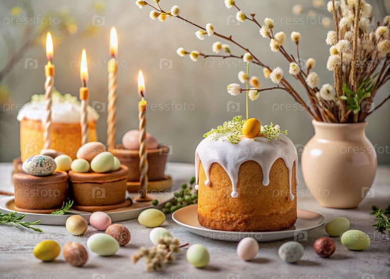 Православный Пасхальный торт, окрашенные яйца, иконы, лица святых, цветы, церковные свечи и пасхальное украшение на деревянном столе в старом деревенском доме