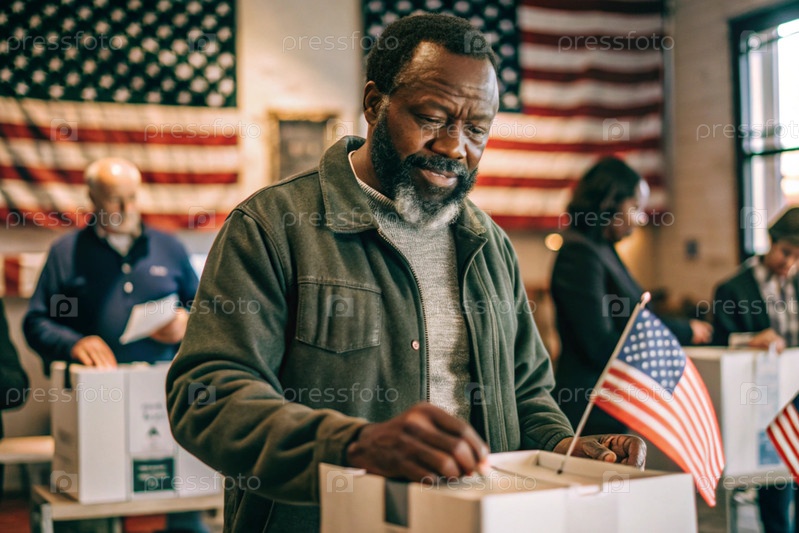 Президентские выборы.Черный человек голосует за нового президента Соединенных Штатов Америки и ставит бюллетень в урну на фоне американского флага