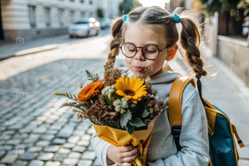Красивая первоклассница с очками и коньими хвостами на голове. Букет осенних цветов. Ребенок впервые идет в школу. Ребёнок с рюкзаком, книгой и цветами. Возвращение в школу