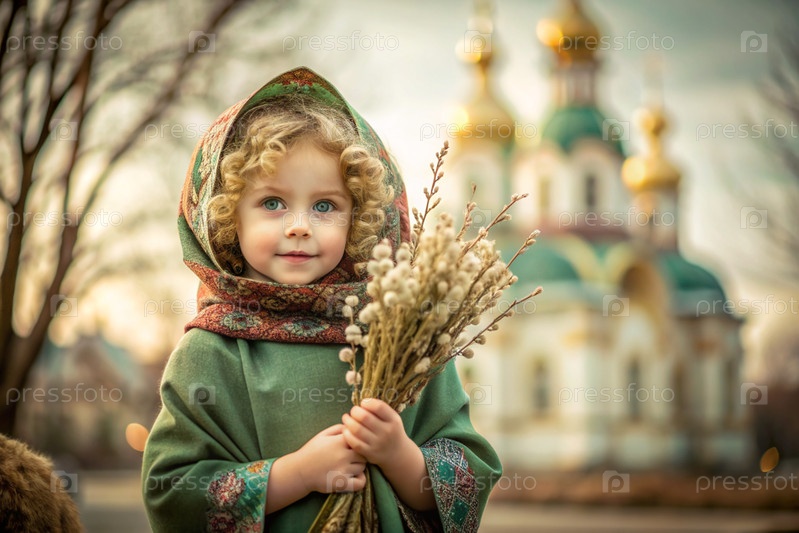 Портрет трехлетней девочки в русском народном шале с букетом дикой травы в руках на фоне православной церкви