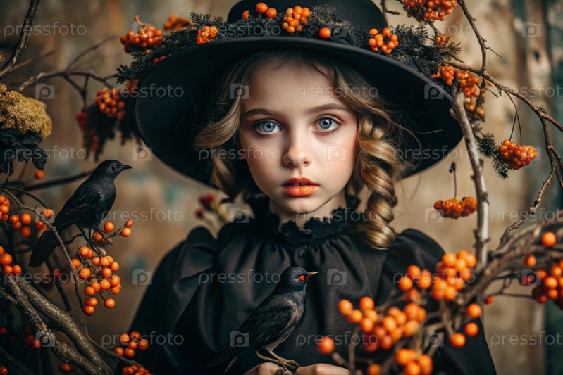 Осенний портрет красивой девушки в костюме ведьмы с осенними ягодами, тыквами и черными птицами. баннер, открытка. концепция Хэллоуина