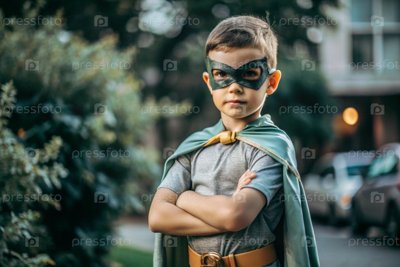 Маленький мальчик в костюме супергероя на улице ребенок со сверхспособностями герой костюмированная вечеринка