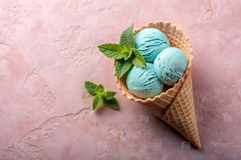 Сладкий десерт. Стильная современная концепция. Бирюзовый мороженый конус на розовом фоне. Всемирный день мороженого
