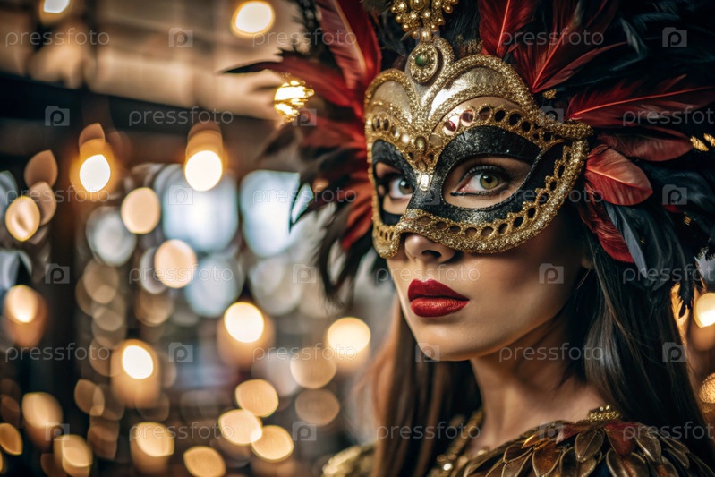Карнавал Венеции.Закрытие женщины в украшенной карнавальной маске.Яркие цвета передают атмосферу празднования и роскоши