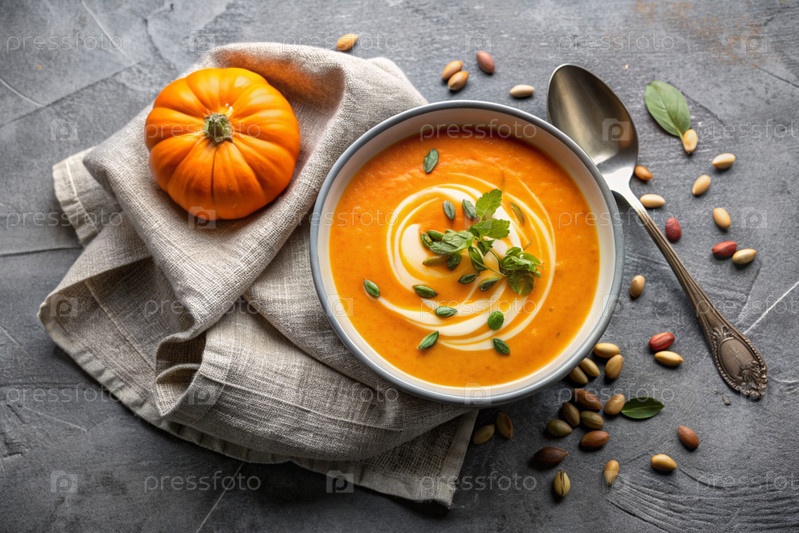 Традиционный мягкий тыквенный кремовый суп с сливками и семьями тыквы на сером бетонном фоне