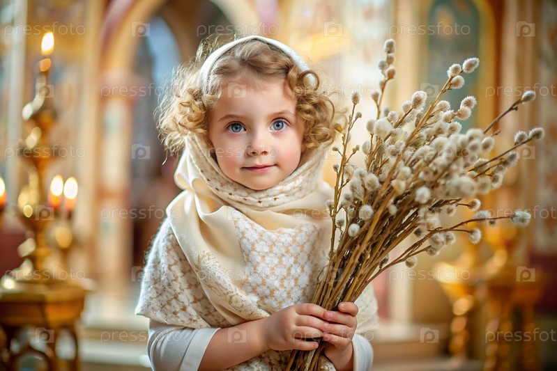 Пальмовое воскресенье. христианство. портрет трехлетней девочки в русском народном шале с ветвями ивы в руках на фоне православной церкви