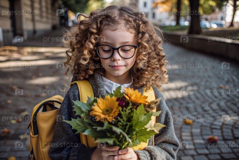 Красивая маленькая кудрявая девочка в очках и букете осенних цветов ходит в школу впервые. Ребенок со школьной сумкой, книгой и цветами. Малыш на городской улице. Возвращение к школе