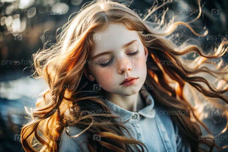 Портрет красивой маленькой рыжеволосой девочки с длинными волнистыми волосами и задумчивым взглядом.Власы развиваются и создают ощущение легкости и естественности