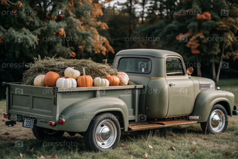 Осень, осенний дизайн.Большой урожай тыквы на заднем сиденье ретро-пикапа, крупный план