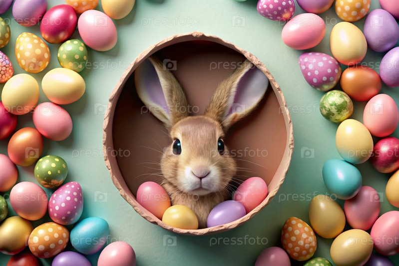 Известный праздник. милый пасхальный кролик заглядывает из ямы с красочными яйцами вокруг. концепция счастливой Пасхи