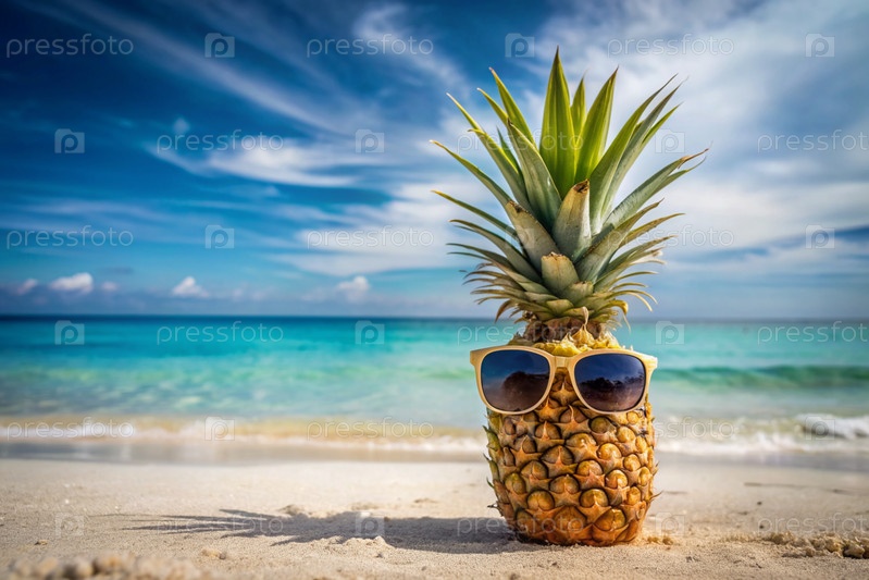 Понятие отдыха и путешествий. Ананас в солнцезащитных очках на пляже тропического моря или океана на фоне голубой воды и неба. Место для текста