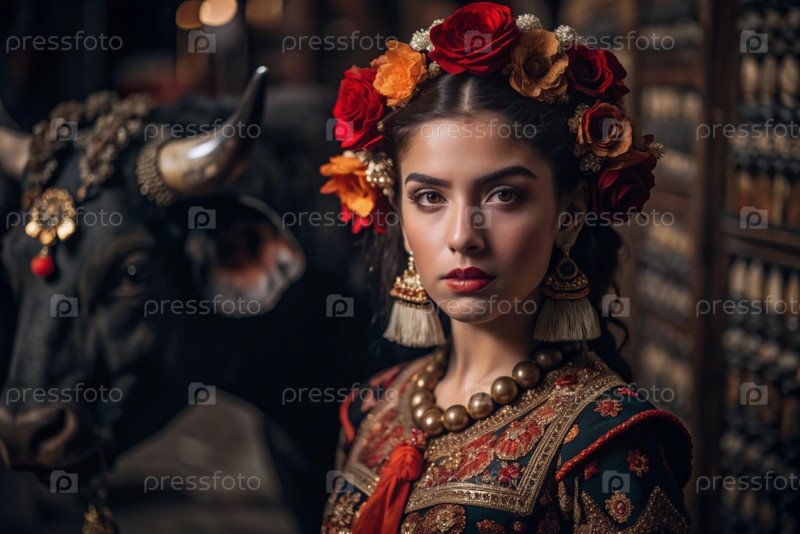 Испанская девушка в традиционном испанском национальном костюме. Перед быком. Бикоборство. Портрет символизирует традиции и культуру народа Испании