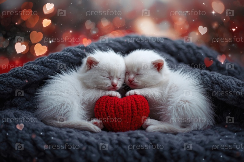 Концепция Дня святого Валентина. красное вязаное сердце и два белых котенка. открытка с котятами на вязанном одеяле