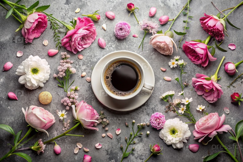 Красивая открытка. чашка кофе с тарелкой и весенними цветами. красивый натюрморт. весна, лето. доброе утро концепция