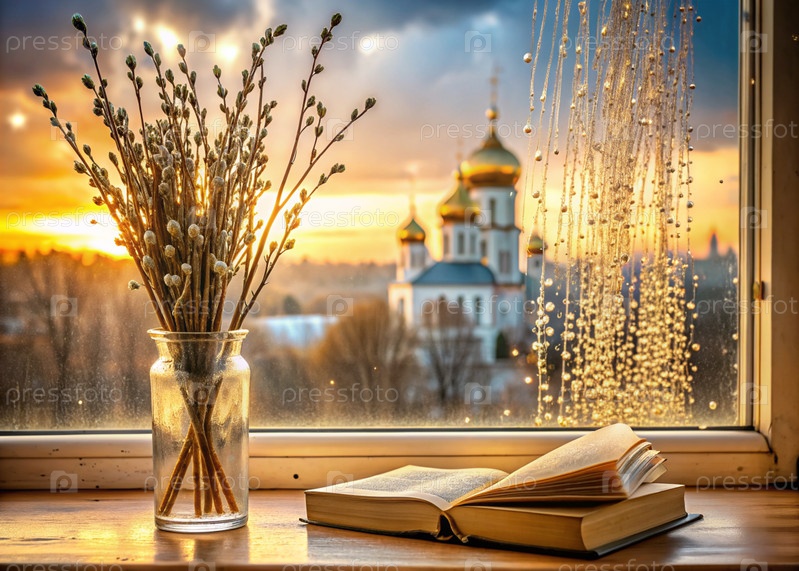 Большой план букета ивы в стеклянной вазе и книги Библии напротив старого белого окна с видом на золотые куполы храма и заходящее солнце