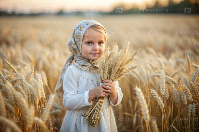 Русская девушка в белом платье и русском шале держит золотые колосья пшеницы на фоне созревающего поля. Концепция посадки и сбора богатого урожая. Сельский пейзаж