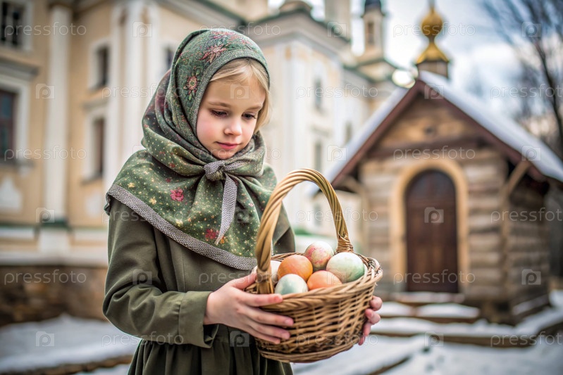 Счастливая Пасха. Христианство. Портрет трехлетней девочки в русском народном платье и шалах с корзиной из плети с пасхальными яйцами в руках на фоне православной церкви