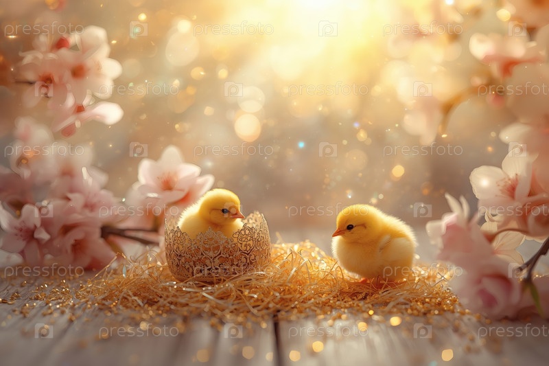 Концепция яркого Пасхального праздника. Нежные розовые пасхальные яйца, желтые курицы и вишневые ветви на деревянном фоне. Концепция ярких пасхальных праздников в 2026 году