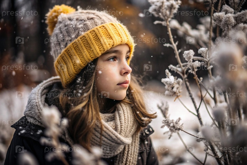 Зимний портрет. Близкий план молодой девушки в вязанной шляпе, шарфе и наружной куртке