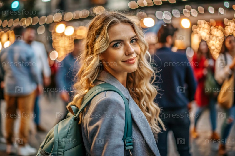 Портрет счастливого красивого путешественника с рюкзаком в городе против прекрасного боке. Путешествие в одиночку, образ жизни. Молодой турист наслаждается отдыхом