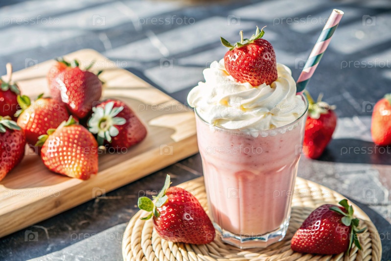 Освежающий клубниковый молочный коктейль с битой сливкой и соломой на столе, окруженном свежими ягодами
