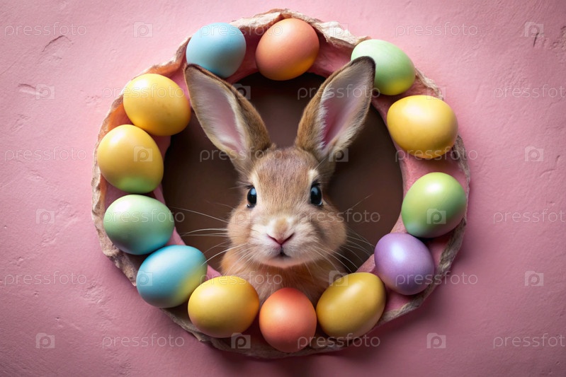 Известный праздник. милый пасхальный кролик заглядывает из ямы с красочными яйцами вокруг. концепция счастливой Пасхи