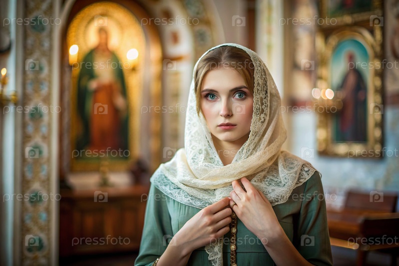 Портрет красивой молодой женщины с платками в православной церкви.Девушка молится в церкви среди икон