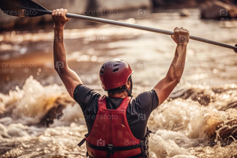 Каякер празднует свою победу с веслом в руках на размытом речном фоне
