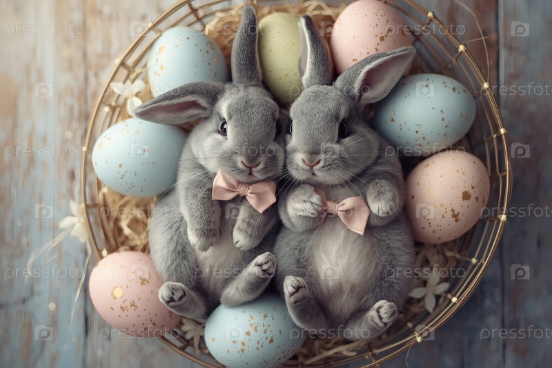 Пасхальные кролики лежат на пасхальных яйцах и смотрят в камеру