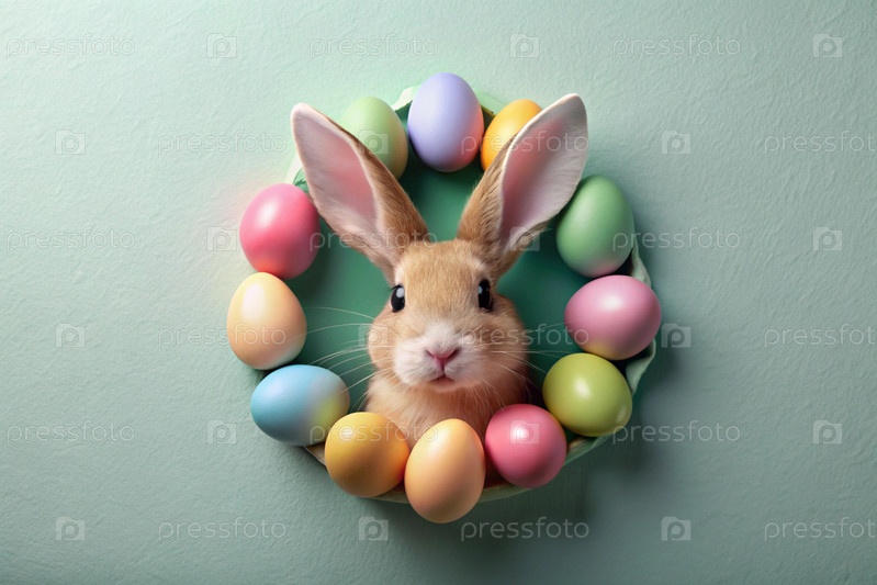 Известный праздник. милый пасхальный кролик заглядывает из ямы с красочными яйцами вокруг. концепция счастливой Пасхи
