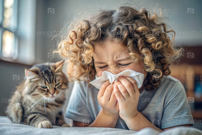 Дома маленькая девочка чихает в белую салфетку. Аллергия на волосы кошек и домашних животных. Рядом со мной сидит котёнок