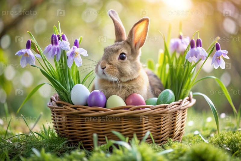 Баннер. пасхальный кролик в корзине из красочных пасхальных яиц вокруг весенних снегопадов и первичной розы. концепция праздника Пасхи