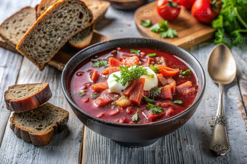 Традиционный украинский и российский борщ в стильной керамической тарелке с травами, сметаной и чесноком