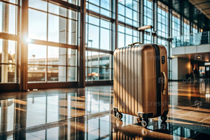 Чемодан в пустом аэропортовом салоне, сумки для путешествий в терминале вылета, концепция летнего отдыха, пространство для текста или дизайна