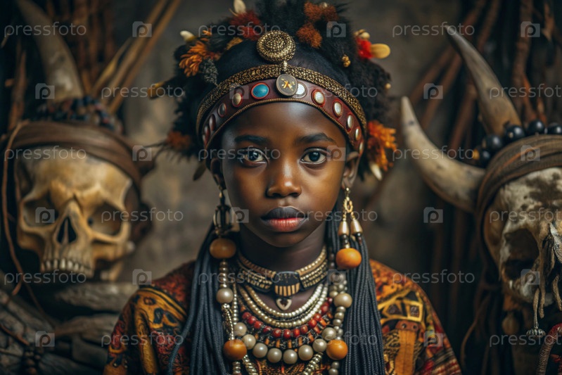 Красивая африканская девушка в традиционном национальном костюме. с костями. портрет символизирует традиции, культуру и красоту африканского народа