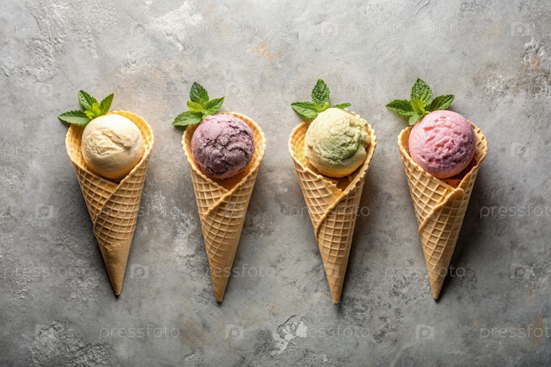 сладкий, холодный десерт. сливочное ванильное мороженое с различными вкусами в конусах пластинок. баннер, реклама. Всемирный день мороженого. сладкий десерт