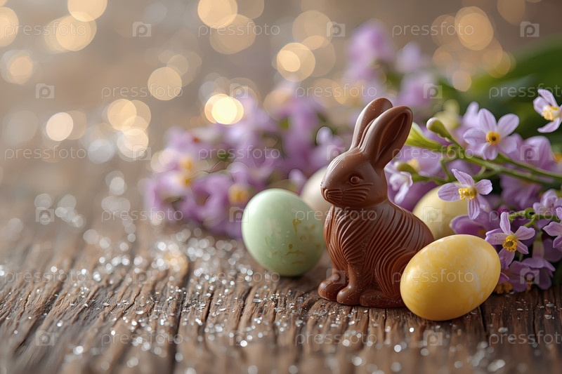 Пасхальные сладости и лакомства. Концепция ярких пасхальных праздников в 2026 году. Хорошая открытка. Баннер. Шоколадные пасхальные яйца, шоколадный кролик и весенние цветы на деревянном фоне