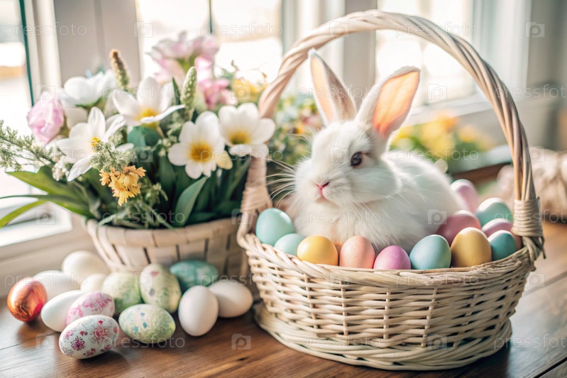 Баннер. пасхальный кролик в плетеновой корзине, наполненной красочными пасхальными яйцами. концепция весенних праздников Пасхи