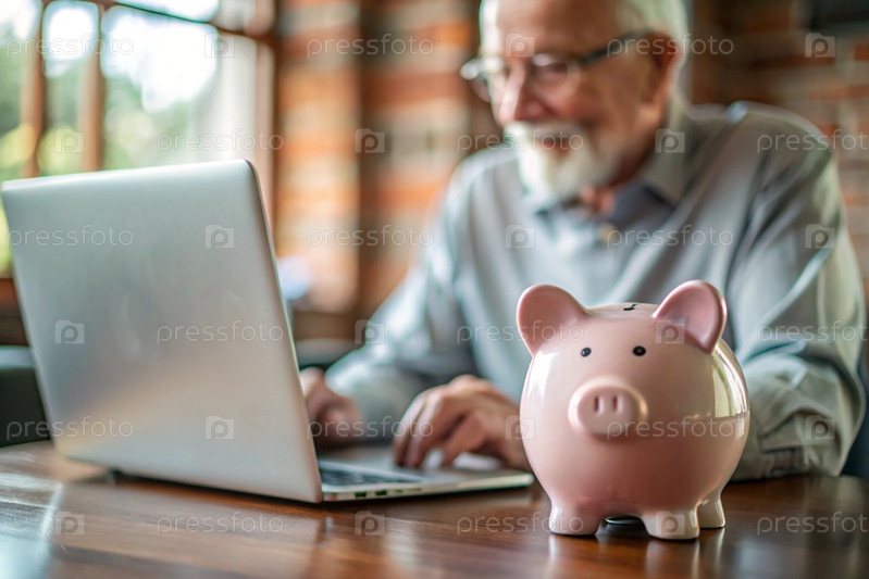 Пенсия. Экономия денег. Сбережения. Пигги-банк в виде свиньи на крупном плане. Старший учится взаимодействовать с ноутбуком для онлайн-платежей, финансов, кредитов, транзакций