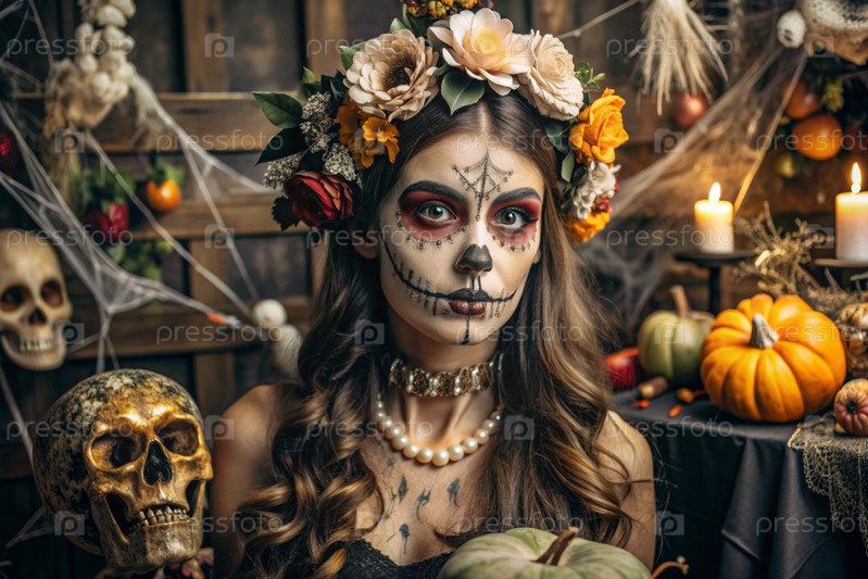 Концепция Хэллоуина. Ужасно. Костюмированная вечеринка. Красивая женщина с покрашенным черепом на лице и цветами на голове. Баннер, открытка